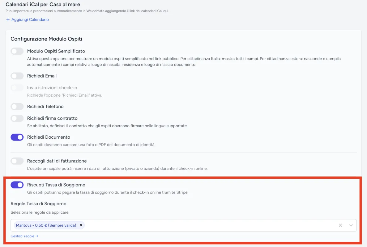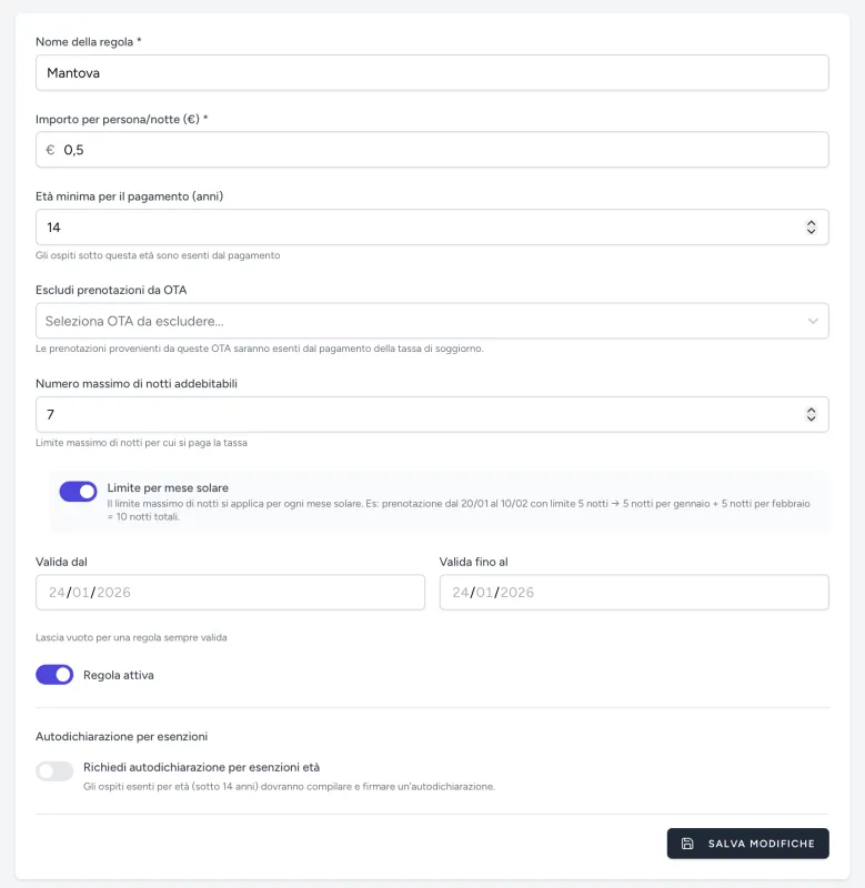 Alla voce “Tassa di Soggiorno”, seleziona la regola appena creata (es. “Mantova”)