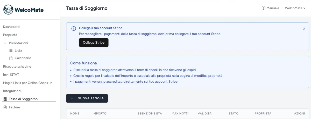 Per poter incassare i pagamenti dell’Imposta di Soggiorno in modo automatico, è necessario collegare un account Stripe a WelcoMate.