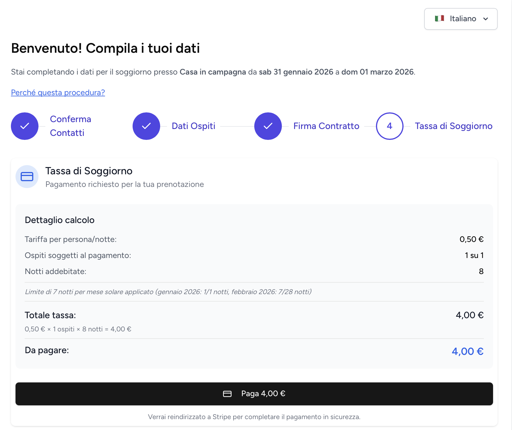 Durante il check-in online, l’ospite vedrà la quota IDS da versare e potrà pagare con carta. Gli importi saranno accreditati sul conto Stripe dell’host.