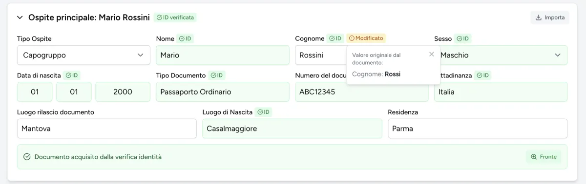Se la verifica va a buon fine, i dati estratti dal documento (nome, cognome, data di nascita, numero documento, nazionalità, ecc.) vengono pre-compilati automaticamente nel modulo di check-in. L'ospite deve solo confermare e, se necessario, correggere eventuali dettagli. Risultato: check-in completato in meno di 2 minuti, con la certezza dell'identità.